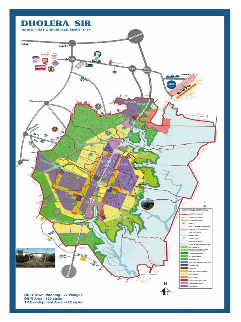 Dholera Smart City is India’s first greenfield smart city, meaning it is planned from scratch with modern infrastructure, zoning systems, and smart technology integration. The city spans hundreds of square kilometers and is divided into residential, commercial, and industrial zones under approved Town Planning (TP) schemes.